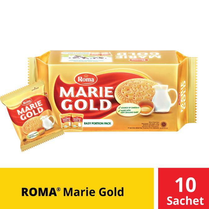 ROMA MarieGold adalah biskuit Marie pertama dengan olesan telur diatasnya. ROMA MarieGold memiliki warna keemasan karena kaya akan Omega-3 dan Kebaikan Susu New Zealand.