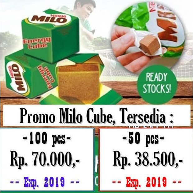 NESTLE MILO CUBE 100 PCS READY Selama Stok Tersedia...!!! Produksi Nigeria, Import Malaysia. Kemasan 1 Pack isi 100 pcs Berat Bersih 275gr Expired 2019 >>> 1kg muat 4 pack (kecuali kurir Wahana 1Kg muat 3 pack)