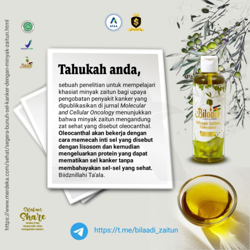 Minyak zaitun BILAADI begitu kaya akan asam lemak tak jenuh tunggal dan antioksidan yang sehat sehingga dapat membantu menjaga kesehatan jantung, mengurangi risiko penyakit kardiovaskular, stroke, dll, biidznillah..
