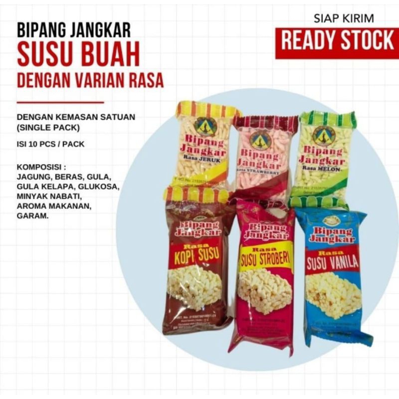 Bipang Jangkar Aneka Buah Rasa Melon isi 10 pcs adalah makanan ringan terbuat dari beras dengan rasa melon. Bipang Aneka Buah Rasa Melon dikemas dengan plastik satuan (single pack).