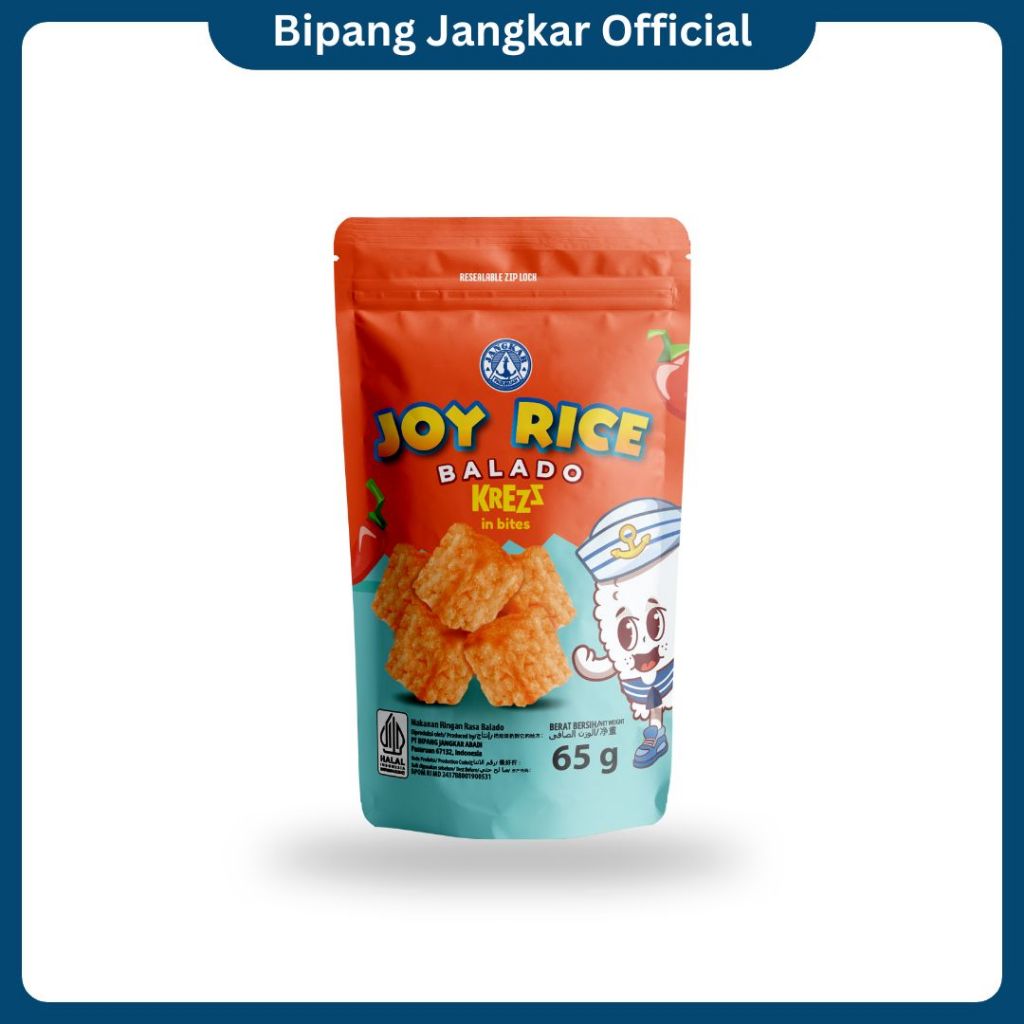 Bipang Joy Rice Flavour adalah makanan ringan terbuat dari beras dengan rasa Balado, Cheese, dan Seaweed yang dikemas dalam pouch kemasan ekonomis dengan ukuran yg praktis untuk sekali makan. Pouch dilengkapi dengan ziplock. Joy Rice memiliki tekstur yg lebih kress dan ringan sehingga sangat cocok untuk cemilan.