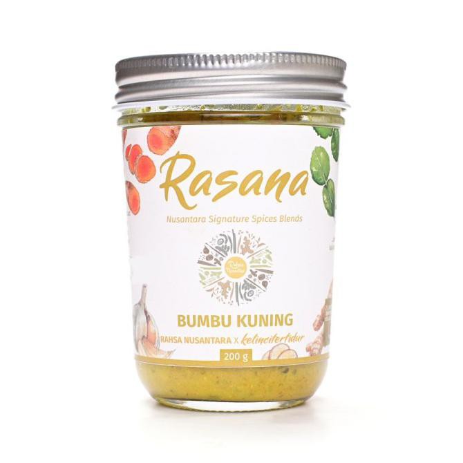 Bumbu Kuning Rasana 200 g terbuat dari Bawang Merah, Bawang Putih, Kemiri, Jahe, Kunyit, Garam Laut, Daun Jeruk, Minyak Kelapa dan Ekstrak Kulit Udang.