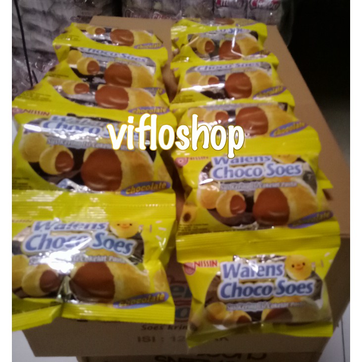 Nissin Walens Choco Soes mini kemasan renceng. 1 renceng isi 10 pcs @ 15 gram. Kue Soes kering isi coklat, Enaakk dan bikin ketagihan!