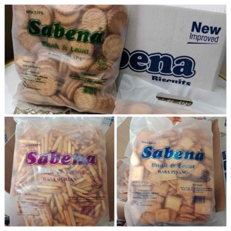 Ready sabena biskuit rasa kelapa, durian dan pisang kemasan 400gram 18rb