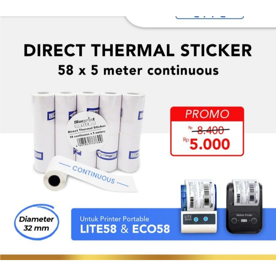 BL-DTS585C 5m Direct Thermal Sticker 58 Continuous x 5 Meter BLUEPRINT LITE 1 Roll Label Stiker Portable