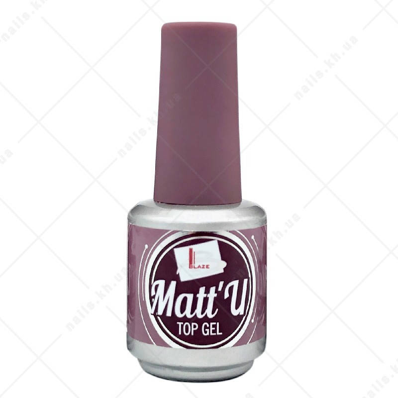 BLAZE Matt'U Top Gel - Матовый топ для гель-лака, придающий покрытию приятный бархатистый финиш. Новый топ от ТМ Блейз Нейлс имеет идеальную бархатистую текстуру, легко наносится, не затекая на околоногтевые валики и кутикулу. Имеет остаточный дисперсный слой, после удаления которого ноготки приобретают идеальный плюшевый эффект. Балгодаря специальной формуле, топ придает матовый эффект, не осветляя темные оттенки и не полосит после снятия липкости. Топ для гель-лака Blaze Matt-U обладает высокой адгезией, хорошо фиксирует слои гель-лака и не требует предварительного нанесения обычного топа.