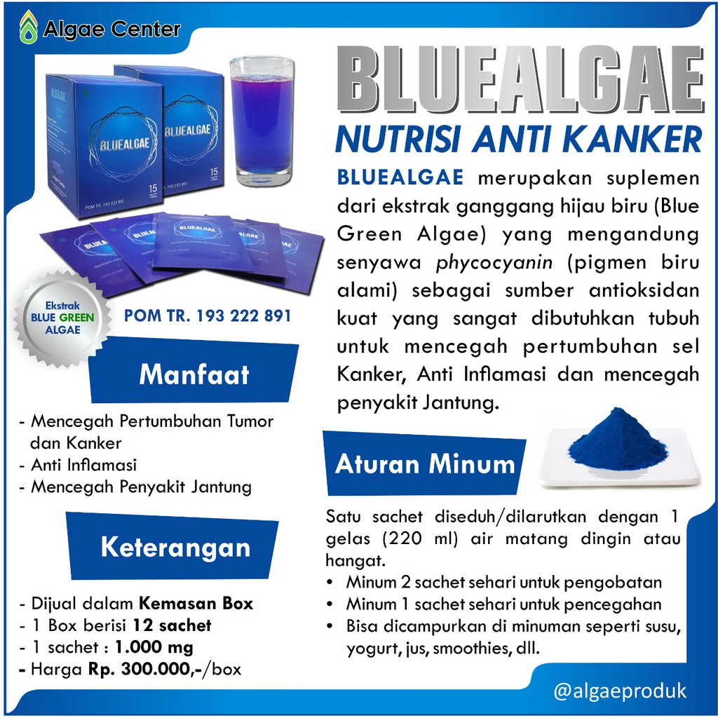 BLUEALGAE merupakan suplemen dari ekstrak gangang hijau biru (Blue Green Algae) yang mengandung senyawa phycocyanin (pigmen biru alami) sebagai sumber ANTIOKSIDAN KUAT yang sangat dibutuhkan tubuh untuk mencegah pertumbuhan sel Kanker, Anti inflamasi dan mencegah penyakit jantung