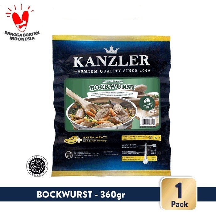 Sosis BOCKWURST Kanzler terbuat dari cincangan daging premium yang halus, disertai rasa khas daun marjoram. Dibuat dengan metode pengasapan, pengeringan dan pemasakan dengan uap. Tanpa menggunakan tambahan MSG atau bahan perwarna.