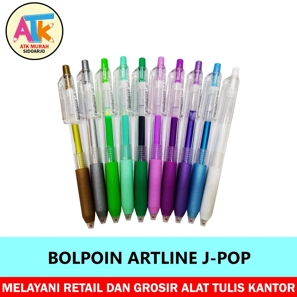 Bolpoin Artline merk Artline J-Pop 0,5mm memiliki berbagai pilihan warna menarik yang dapat digunakan untuk menulis, menggambar, atau mewarnai. Warna-warna tersebut terdiri dari metalik gold, metalik silver, green, milky green, fluorescent green,milky white ,metallic purple ,fluorescent purple,milky purple,dan metallic sky blue.