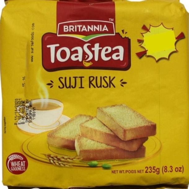 .Britannia Suji Rusks yang dikemas dengan energi dan nutrisi mengandung kebaikan susu. Dipasangkan dengan secangkir teh yang mengepul, ini dapat memulai hari Anda dengan kerenyahan yang sempurna. Britannia Rusk mengandung Nol% Transfat. Dipanggang dengan sempurna dan diperkaya dengan elaichi (kapulaga). Britannia Toasts akan memuaskan selera pribadi setiap keluarga Anda. Britannia telah menciptakan rangkaian roti panggang dengan kombinasi ideal antara keringanan dan kerenyahan.