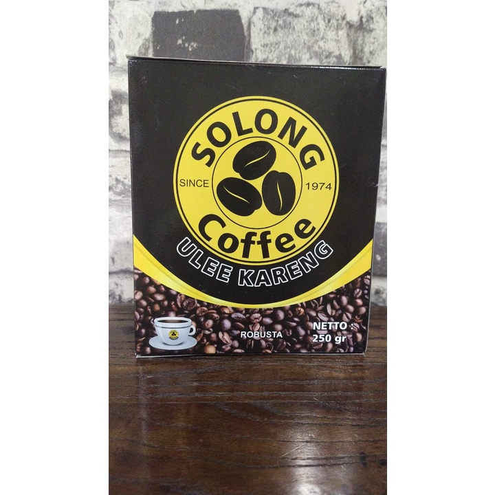 Bubuk kopi robusta Solong Aceh Gayo dalam kemasan kotak, terbuat dari kopi murni 100 % robusta Aceh Gayo, produksi Solong Ulee Kareng, Banda Aceh sejak 1974