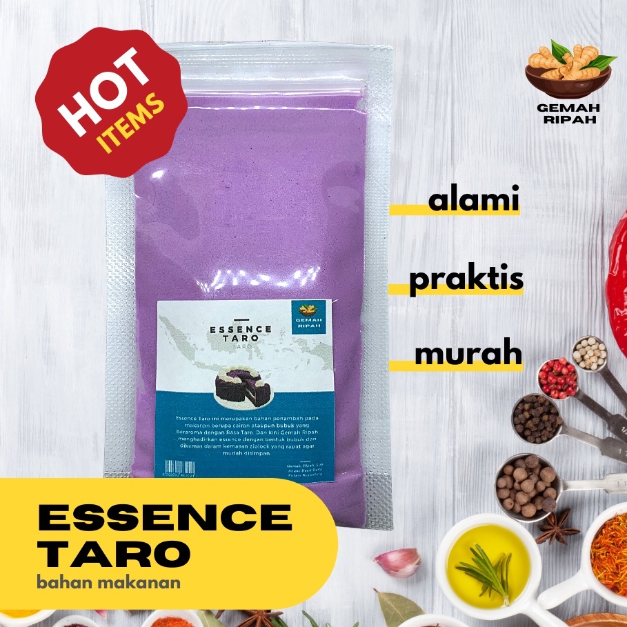Gemah Ripah merupakan toko retail yang menyediakan bumbu serta bahan makanan lainnya yang tepat dijadikan teman memasak Ibu di dapur. Salah satunya adalah Bubuk Essence Taro ini selain sangat banyak kebermanfaatannya dengan tubuh kita, citarasa yang khas nya membuat makanan menjadi lebih nikmat. Banyak kita jumpai olahan bahan makanan tersebut dalam komersial pasar.