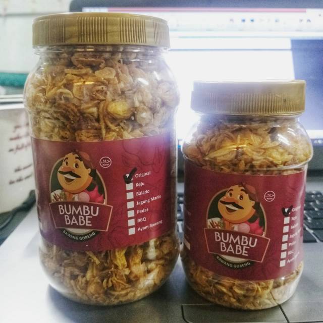 Bumbu babe bawang goreng aneka rasa. Dijamin 100% terbuat dari bawang, tanpa campuran lainnya.