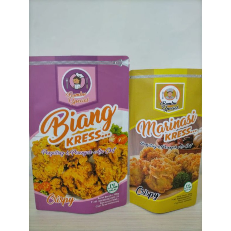 Bumbu Biang Kress adalah pengeriting dan perenyah tepung, terbuat dari rempah2 pilihan jd praktis, tidak perlu menambah bumbu2 lagi, cukup siapkan minyak, terigu dan ayam. penggunaan ya sangat hemat, cukup 2 sdm atau 50gr utk dicampur dg 1kg terigu protein sedang, jd swbungkus biang bisa utk membumbui 15kg terigu.