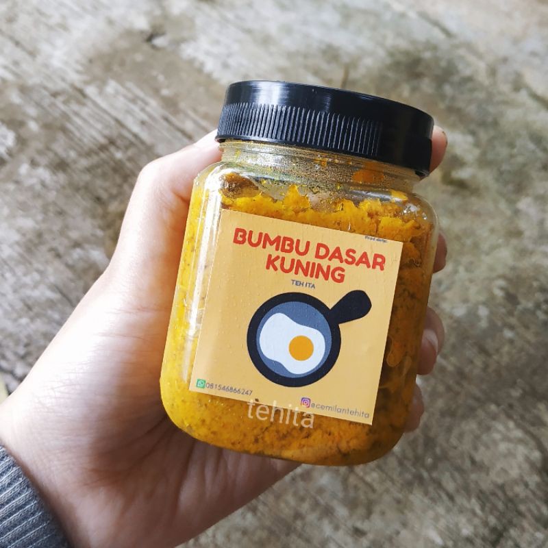 bumbu dasar kuning terbuat dari bawang merah, bawang putih, kemiri, lengkuas, jahe, kunyit dan merica. Membuat anda tak perlu lagi susah-susah ngulek bumbu kalau mau masak. Tinggal colek Bumbu Dasar Kuning ini semua jadi beres.