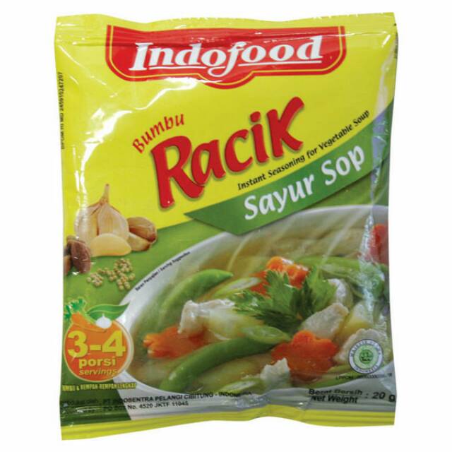 rempah asli untuk sop. Cukup 1 sachet, satu hidangan sayur sop lezat cepat tersaji. Tak perlu tambahan bumbu lainnya. Cukup siapkan bahan-bahan untuk direbus, lalu taburkan 1 sachet Racik Sayur Sop dan masak hingga matang. Tersedia dalam kemasan sachet 20 gr, cukup untuk 3-4 porsi.