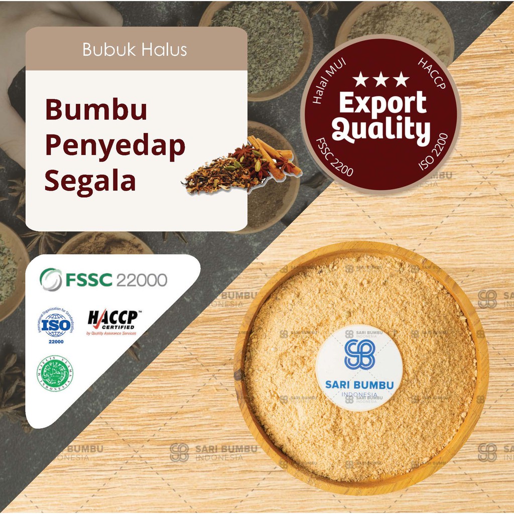 Bumbu Penyedap Segala yang di proses dengan sangat higienis dengan standar mutu Internasional.Bumbu Penyedap Segala ini murni tanpa campuran dan melewati 3 tahapan pembersihan dengan mesin standar produksi untuk Ekspor ke Jepang. Citara rasa original dengan aroma yang berkelas membuat bumbu ini biasa digunakan untuk masakan yang memiliki cita rasa pedas dan biasa digunakan untuk kuliner bersantan dan juga ditumis.