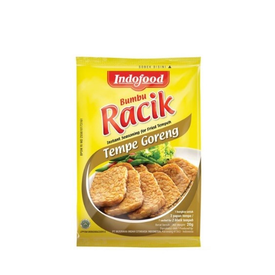 Indofood Racik Tempe Goreng merupakan tepung bumbu instan yang dapat digunakan untuk menggoreng tempe dengan sangat praktis. Indofood Racik Tempe Goreng terbuat dari racikan bumbu berkualitas tanpa pengawet dan pewarna sintetis sehingga dapat menghasilkan tempe goreng yang renyah, gurih dan lezat, serta aman digunakan karena telah bersertifikat halal dan sudah terdaftar resmi di BPOM.