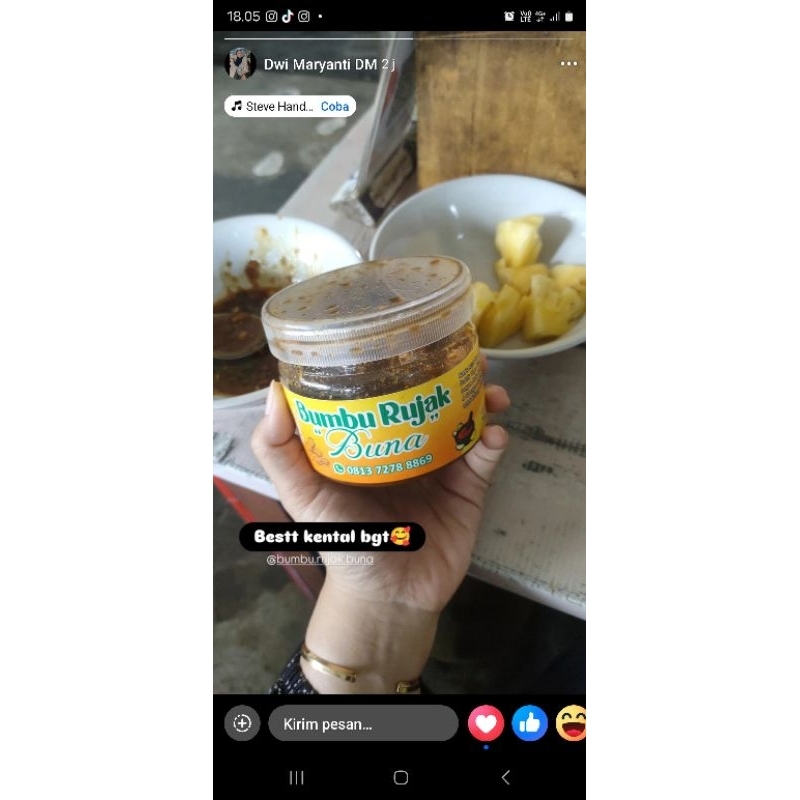 Bumbu rujak buna asli homemade, praktis tanpa ribet, bisa dinikmati kapan & dimana saja dengan aneka buah²an segar, keripik/camilan ringan & gorengan ala rumahan, cocok untuk oleh²/buah tangan keluarga & kerabat tercinta.