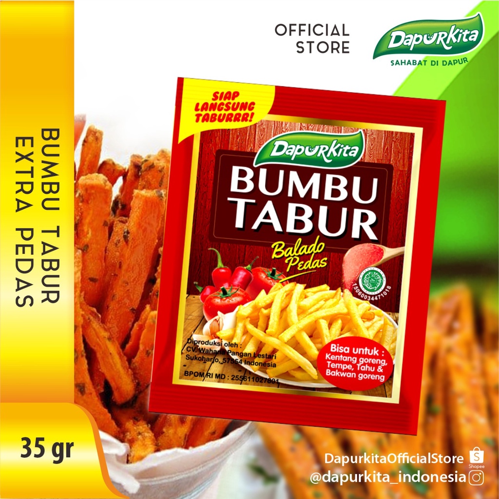 Bumbu Tabur Rasa Ekstra Pedas Dapurkita merupakan bumbu tabur instan dengan rasa balado extra pedas sehingga cocok untuk kentang goreng, tempe goreng, tahu, bakwan goreng, produk snack keripik, kerupuk (berbahan makaroni), kentang, singkong juga untuk produk olahan daging (baso, nugget dan lainya).