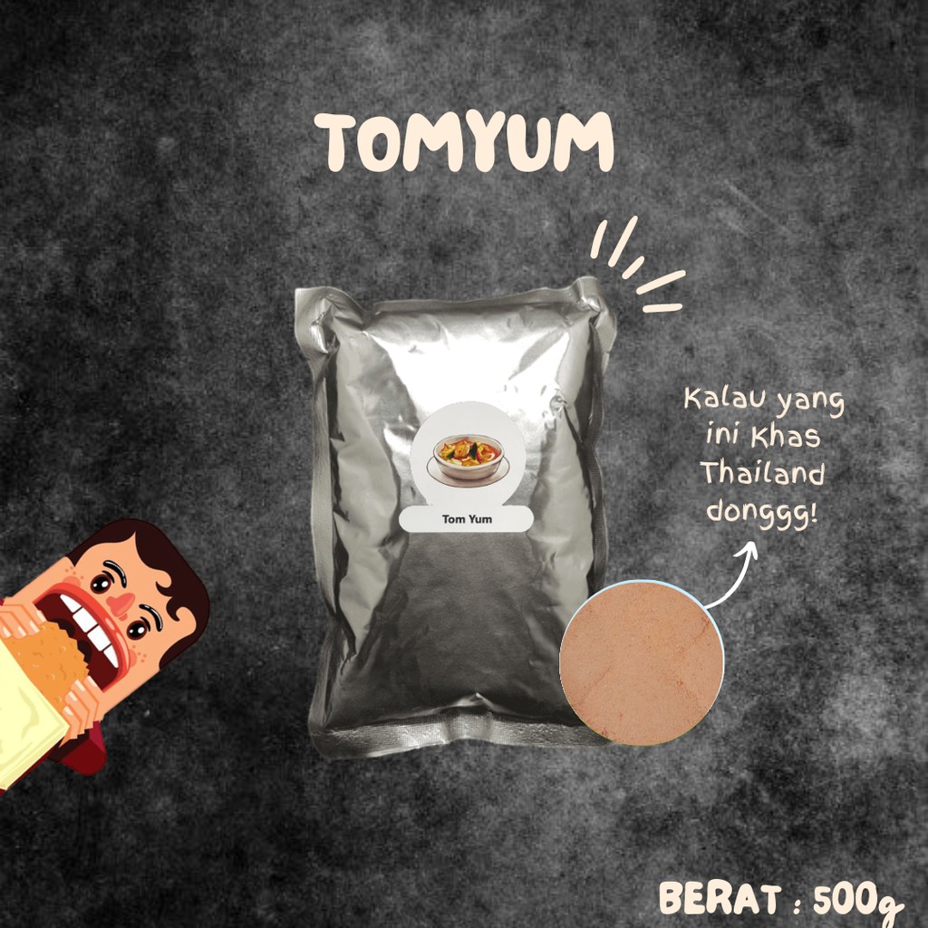 Bumbu tabur Tom Yam ini memiliki rasa tom yam yang sedikit asam, pedas dan gurih. Bumbu Tom yam , sangat cocok digunakan taburan rasa aneka keripik, (seperti keripik singkong, keripik usus, keripik kentang, keripik jamur, keripik tempe, rengginang, kerupuk cumi, macaroni, lidi, dll). Atau dapat ditaburkan di berbagai macam cemilan / gorengan (seperti kentang goreng, snack kulit ikan, tahu bulat, bakso goreng, singkong, pangsit, dll).