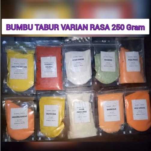 BUMBU TABUR VARIAN RASA : + Bumbu Tabur Cap Varian Rasa. + Berat Timbangan 50 Gram. + Berat Pengiriman 100 Gram. + Tinggal Di Tabur Di Segala Makanan. + Gorengan, Kuah, Kerupuk, dll. + Simpan Di Tempat Sejuk dan Tertutup. + Varian Rasa : 1. Jagung Manis 2. Dendeng Balado 3. Ayam Bakar 4. Seawed 5. Pizza Pedas 6. Jagung Bakar 7. Salted Egg 8. Ayam Panggang 9. Barbeque 10. Keju Special Note : - Kurir : Instan, Sameday, Reguler. - Pickup Reguler : 16.00 Wib. - Pickup Instan n Sameday : 11.00-15.00. - Hari Minggu Libur Pickup Reguler. - Packing Free : Plastik Klip dan Kardus. - No Retur : Membeli Berarti Setuju. - Tambah Packing Bubble Wrap : https://shopee.co.id/product/278850922/10557143796?smtt=0.278856364-1633694284.3 >>>Terimakasih Telah Membeli