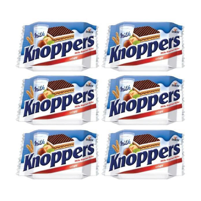 Knoppers adalah Wafer Hazelnut Susu; Wafer Panggang yang renyah, diisi dengan krim susu yang lezat dan olesan hazelnut lezat yang disempurnakan dengan potongan hazelnut panggang yang renyah.