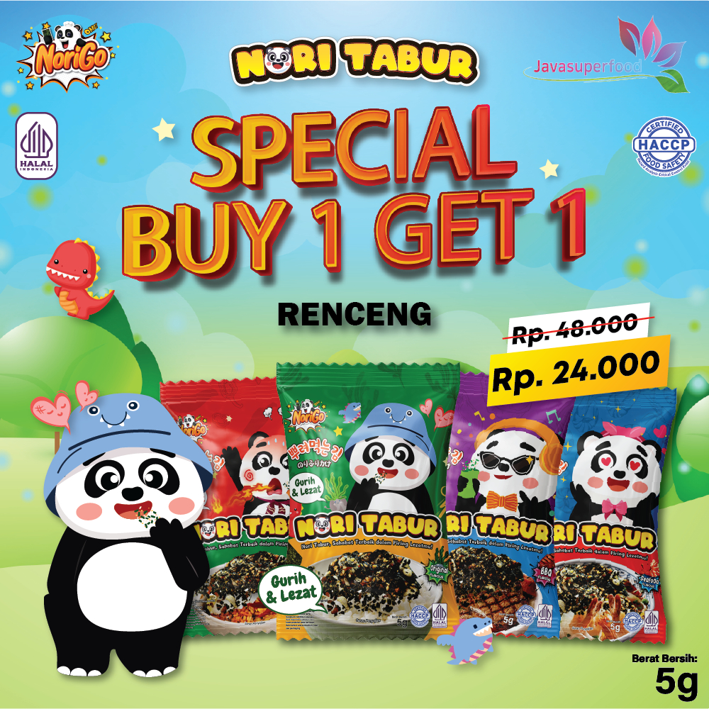 NoriGo menghadirkan Nori Tabur dengan potongan rumput laut panggang, dengan taburan rice noodle, biji wijen, bawang merah dan minyak wijen yang digunakan sebagai taburan toping pelengkap nikmat makanan lezatmu.