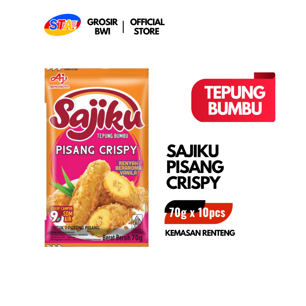 Sajiku® Tepung Bumbu Pisang Crispy terbuat dari perpaduan tepung dan ekstrak vanilla yang menghasilkan aneka gorengan yang renyah dan manis beraroma vanilla. Praktis hanya dengan menambahkan 9 sdm air tanpa tambahan bahan lainnya.