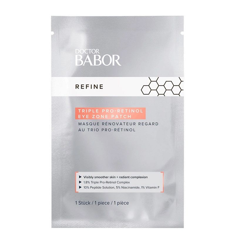 Маска-патч DOCTOR BABOR для области под глазами, зоны скул и спинки носа освежает, восстанавливает сияние и ревитализирует кожу благодаря тройному комплексу Про-Ретинол и сужающему поры ниацинамиду.