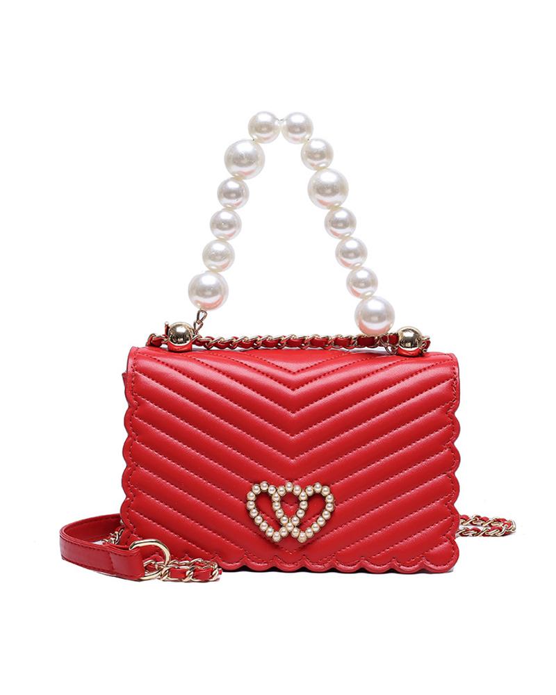 Baisc Chevron Heart Pattern Beaded Chain Satchel Bag, Red