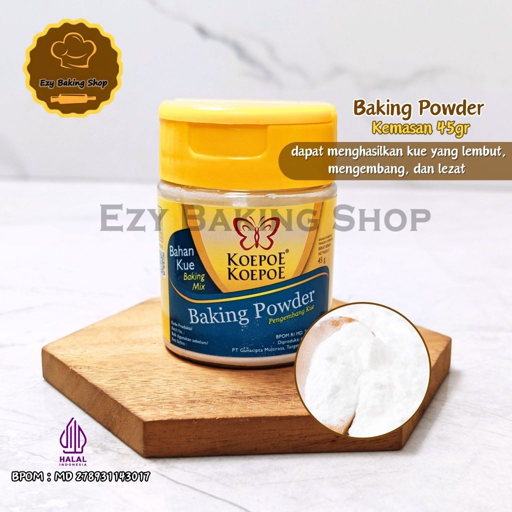 Baking powder Koepoe Koepoe digunakan untuk mengembangkan berbagai macam adonan kue, bolu, roti, dan biskuit. Dibuat dari bahan pilihan yang bermutu tinggi untuk kesempurnaan kue anda.