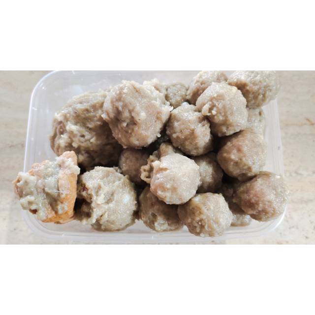 Dengan berat 1kg isi Bakso Telur, Bakso daging spicy, bakso kecil dan bakso tahu..udah termasuk bumbu kuahnya juga