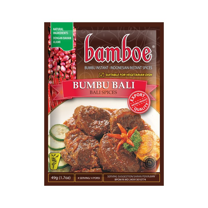 Bamboe Bumbu Bali 49gr merupakan bumbu bali instan yang telah dikenal sejak tahun 1968. Diproduksi menggunakan pilihan bahan-bahan natural yang fresh dan berkualitas, tanpa tambahan extract, essence, maupun pewarna buatan. Kini hadir dalam kemasan yang praktis untuk mempermudah anda menyajikan hidangan spesial untuk keluarga . BPOM: MD 255613052074