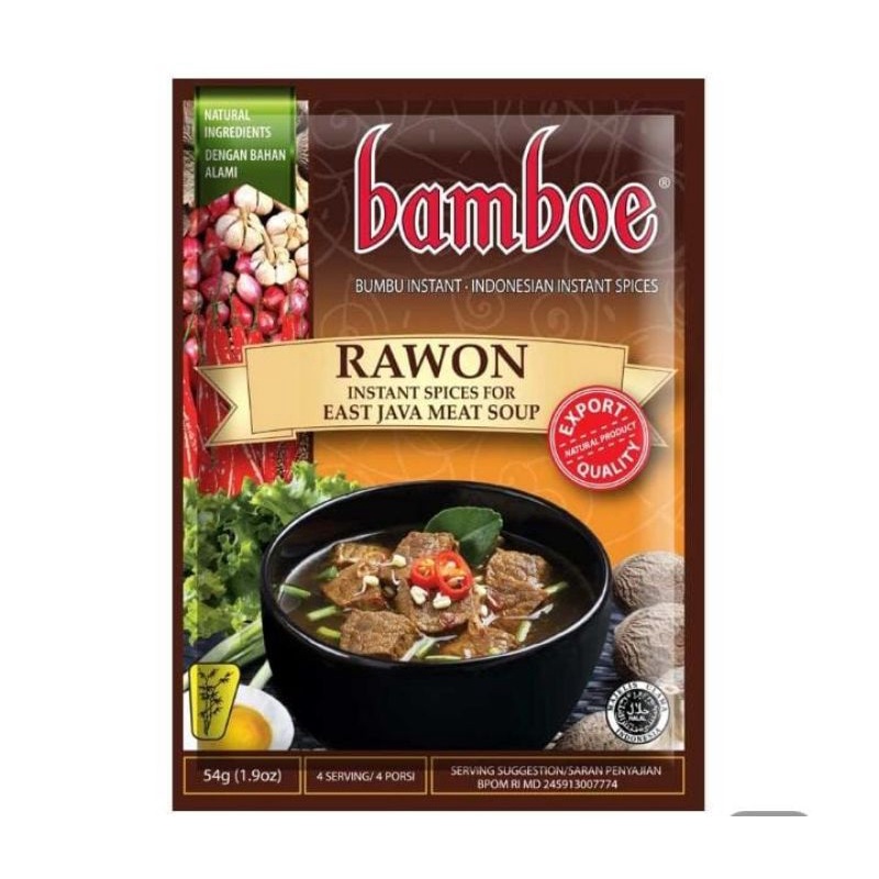 bamboe Bumbu Instant Rawon 54 g merupakan bumbu instant siap olah yang dibuat untuk memudahkan dalam mengolah dan menghasilkan rawon khas Indonesia yang lezat. Bumbu rawon instant dari bamboe ini terbuat dari paduan bahan-bahan alami yang segar dan diolah secara higienis sehingga menghadirkan bumbu dengan citarasa dan kualitas ekspor. Tersedia dalam kemasan 54 g yang ideal untuk penyajian 4 porsi, bumbu instan bamboe ini praktis dan mudah digunakan untuk membantu membuat rawon lezat tanpa perlu repot.