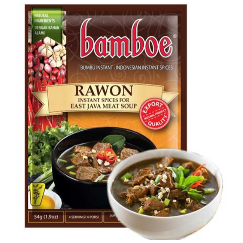 Bumbu instant siap olah yang dibuat untuk memudahkan dalam mengolah dan menghasilkan rawon khas Indonesia yang lezat. Bumbu rawon instant dari bamboe ini terbuat dari paduan bahan-bahan alami yang segar dan diolah secara higienis sehingga menghadirkan bumbu dengan citarasa dan kualitas ekspor. Tersedia dalam kemasan 54 g yang ideal untuk penyajian 4 porsi, bumbu instan bamboe ini praktis dan mudah digunakan untuk membantu membuat rawon lezat tanpa perlu repot.