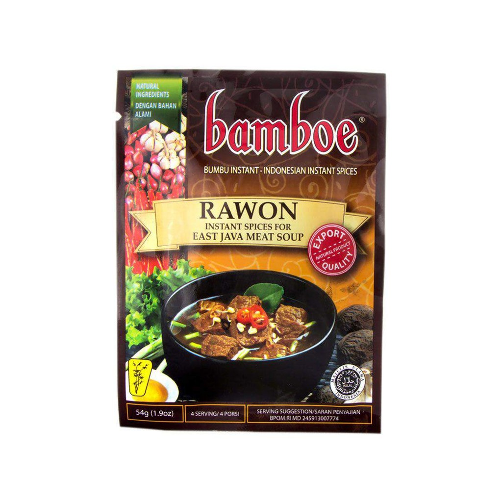 Bamboe Bumbu Rawon [54 gr] adalah salah satu bumbu instan yang praktis, Dengan memasak menggunakan bumbu racikan ini maka dapat menyempurnakan hidangan Anda sehari-hari. Bumbu ini dibuat dari perpaduan bahan-bahan dapur pilihan yang penuh kualitas. Menghadirkan cita rasa ala Indonesia yang pekat, rasanya dan khas benar di setiap suapan.