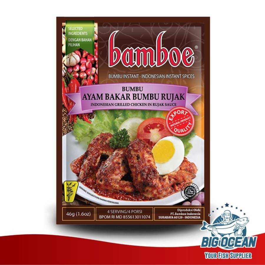 Bamboe Bumbu Bali adalah bumbu instan yang praktis untuk membantu memasak Ayam masak berbumbu. Bumbu ini diolah menggunakan bahan-bahan pilihan yang berkualitas untuk menghasilkan hidangan bumbu bali yang lezat. Cocok untuk membuat bumbu bali dari berbagai bahan daging, seperti sapi, kambing, bahkan ayam. 1 sachet bumbu instan ini memiliki berat 35 gram dan dapat digunakan untuk memasak 4 porsi makan.
