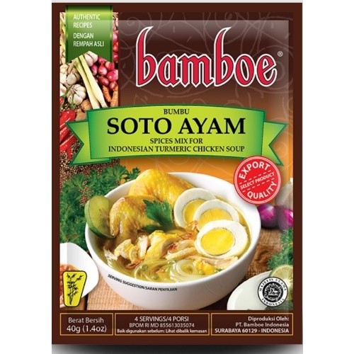 Bamboe Bumbu Soto Ayam [40 GR] adalah salah satu bumbu instan yang praktis, Dengan memasak menggunakan bumbu racikan ini maka dapat menyempurnakan hidangan Anda sehari-hari. Bumbu ini dibuat dari perpaduan bahan-bahan dapur pilihan yang penuh kualitas.