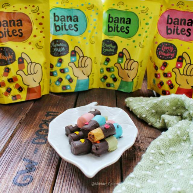 Banabites adalah segigit coklat yang membalut crepes original banana. Ukuran nya yang single bite memberi sensasi kunyahan yang berbeda. Semua rasa menyatu dalam satu gigitan.