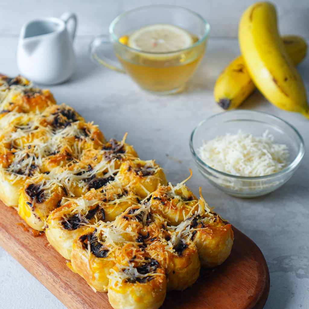 Isi 24pcs mini rolls dengan filling pisang, serta topping keju dan coklat!