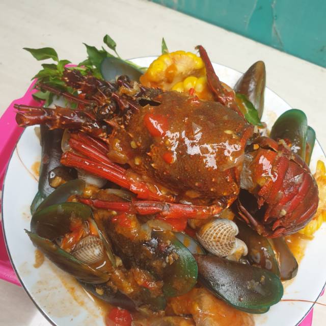 2 jenis kerang ijo dan dara ditambah dgn udang dan kepiting serta lobster, disajikan dgn bumbu yg tumpah ruah dr bhan baku terbaik yg disajikan menggugah selera dan menggoyg lidah porsi kenyang dgn hrga humanis