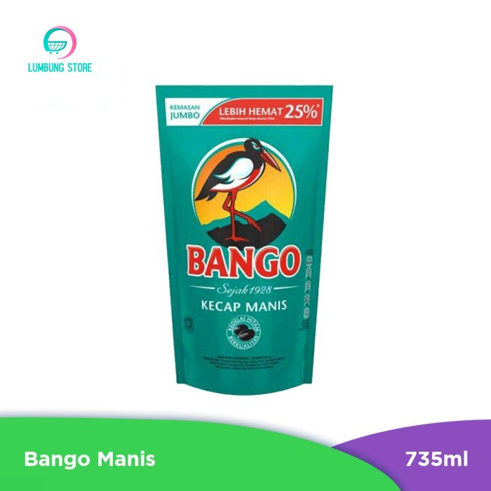 Bango Kecap Manis Pouch merupakan kecap manis yang terbuat dari bahan alami pilihan seperti kedelai hitam berkualitas, gula kelapa, garam, dan air. kedelai hitam pilihan difermentasi terlebih dulu beberapa bulan untuk kemudian melalui proses pengolahan khusus agar dapat berpadu sempurna dengan bahan-bahan lain untuk menghasilkan citarasa unik yang membuat Kecap Bango berbeda dari kecap-kecap lainnya.