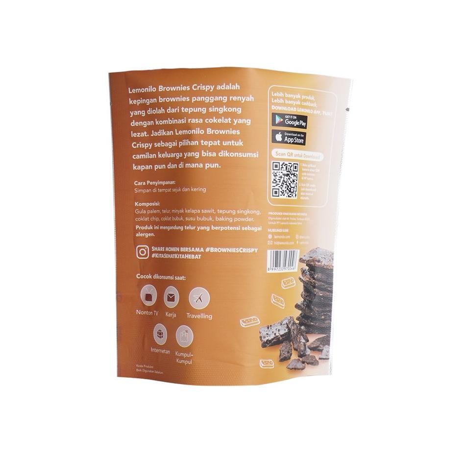 Lemonilo Brownies Crispy Rasa Chocochips adalah brownies panggang renyah dari tepung singkong asli dengan rasa cokelat yang pas. Ngemil manis yang enak dan dimakan kapan saja, di mana saja? Lemonilo Brownies Crispy Rasa Chocochips pilihannya!