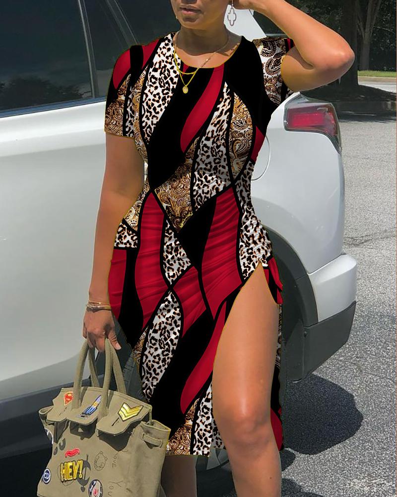 Baroque Leopard Print Drawstring Ruched Slit Dress, Red
