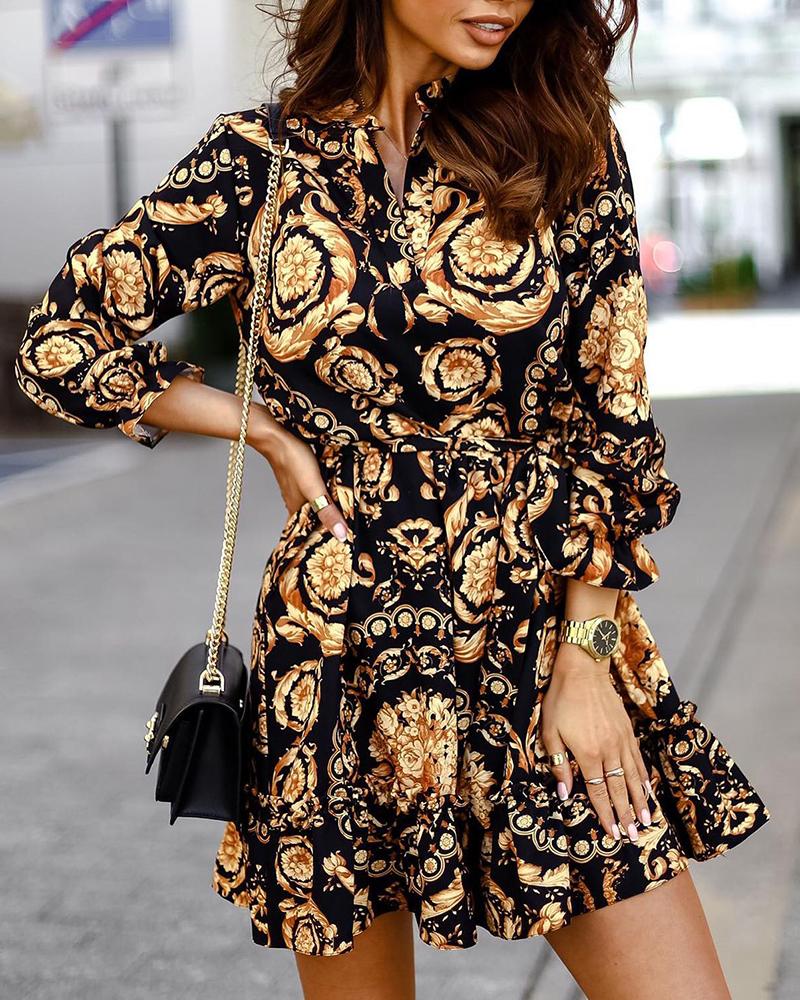 Baroque Print Buttoned Ruched Dress, Black