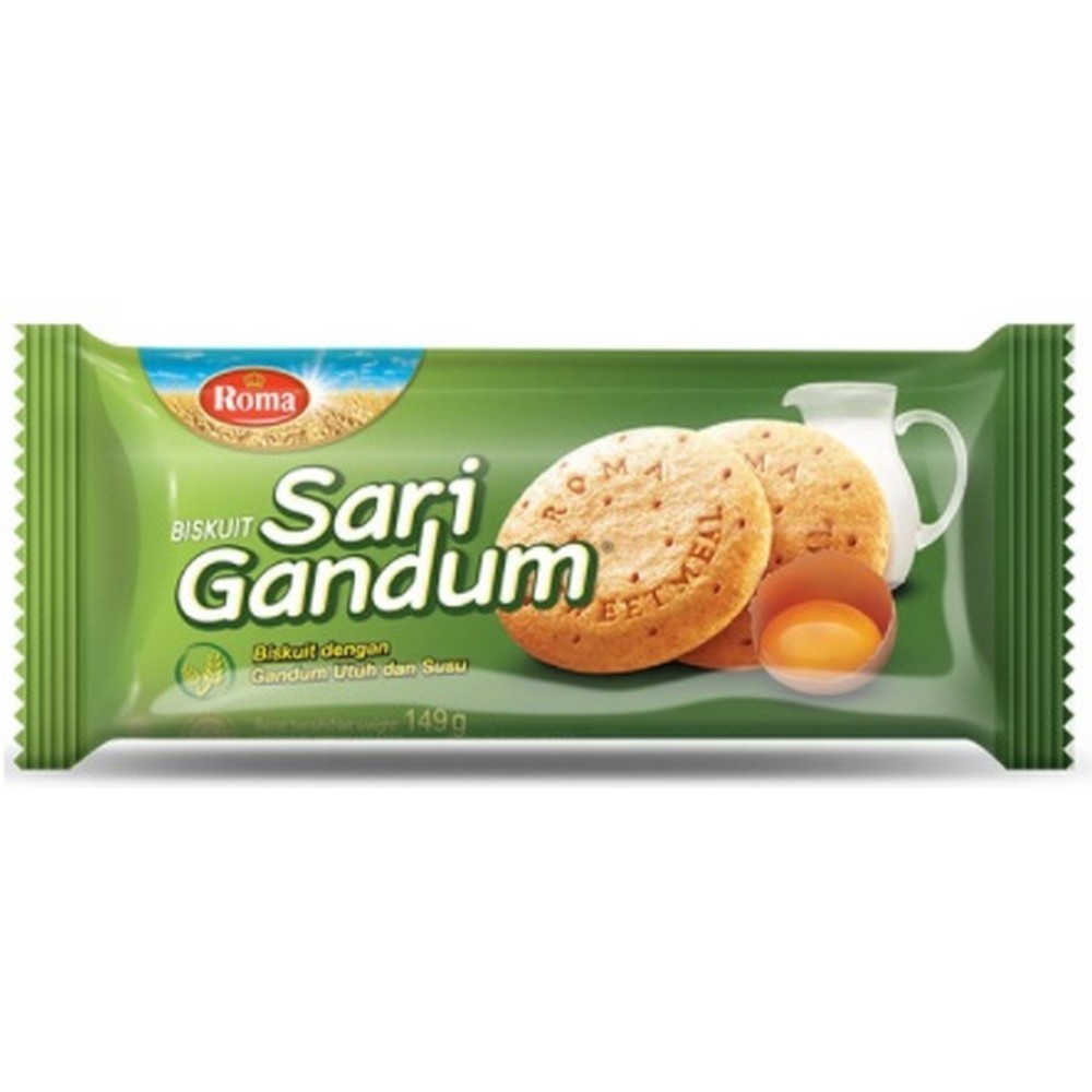 Biskuit Roma Sari Gandum825 149gr dibuat dari gandum yang mengandung Serat, Protein dan Vitamin B dengan rasa yang enak didalamnya.