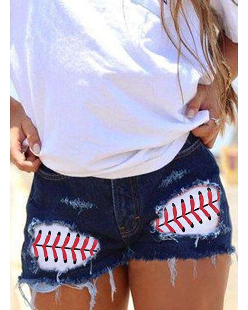 Baseball Print Patchwork Raw Hem Ripped Denim Shorts, Blue
