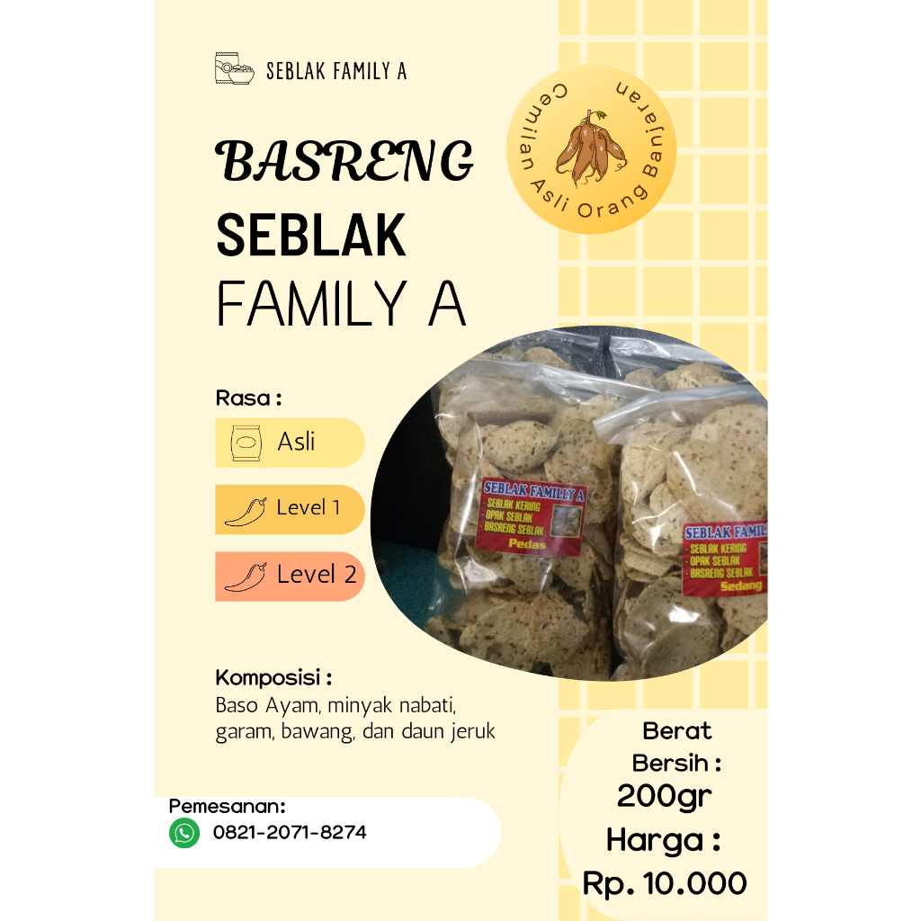 Basreng renyah dengan bumbu cabai asli dan rempah Indonesia , enak untuk ngemil bisa juga jadi toping makan nasi atau makan bakso dll , Basreng Seblak seblak Family A bisa menemani cemilan harian dirumah , happy shopping, selamat menikmati :)