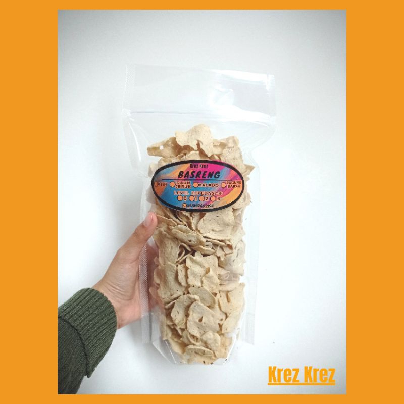 Keripik basreng yang renyah dengan berbagai pilihan rasa dengan berat bersih ±220 gram.